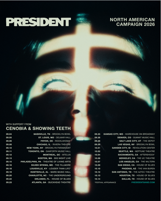 Today, the band announces its upcoming North American 2026 headline tour, with support from Cenobia and Showing Teeth on select dates. Produced by Live Nation, the tour is set to kick off September 4 at Brooklyn Bowl in Nashville, making stops across the U.S in Chicago, New York, Toronto, Boston, Atlanta, Denver, Seattle, Los Angeles. and more before wrapping up in Dallas at House of Blues on October 14. Fresh off their first-ever full U.S. run supporting Bad Omens, PRESIDENT will return this fall to headline venues across the continent.