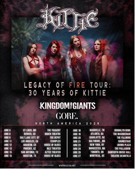 Canadian heavy music pioneers Kittie celebrate three decades of uncompromising metal with the announcement of the “Legacy Of Fire Tour: 30 Years of Kittie,” a massive 16-date North American headline run launching this June, their first full headline tour in over ten years. The tour marks a milestone moment for the band, honoring 30 years since Kittie‘s formation in 1996 while riding the momentum of their recent triumphs including 2024’s critically acclaimed comeback album “Fire” and 2025’s “Spit XXV” re-recorded and re-imagined anniversary EP. Kingdom of Giants and Gore will join as special guests across all dates, creating a powerhouse lineup that spans generations of heavy music. The tour kicks off June 6th in St. Louis and runs through June 27th in Montreal, hitting major markets including New York, Nashville, Toronto, and more. Pre-Sales start Tuesday, March 3rd with tickets going on general sale at 10am local on Friday, March 6th HERE.